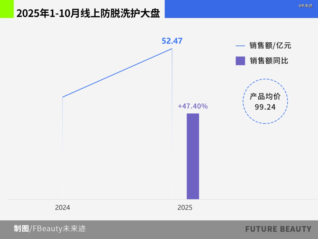 再来看市场大盘,根据2025年1–10月最新数据,防脱洗护市场仅十个月的销售额就达到52.47亿元,已经超过2024年全年46.77亿元,同比增幅超过47%。销量从去年的约4.8亿件上涨到今年的5.29亿件。量在涨、价也在涨,商品平均单价从约97.4元提升到接近100元。