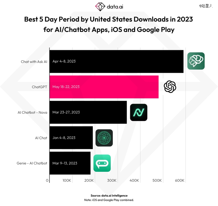 2023年4月,一个叫Chat with Ask AI的App上架iOS商店,比OpenAI官方的ChatGPT App整整早了一个月。仅凭名称占坑,这个App首周就拿下了59万下载,等到官方版上线时,它还压着ChatGPT排在免费榜*。