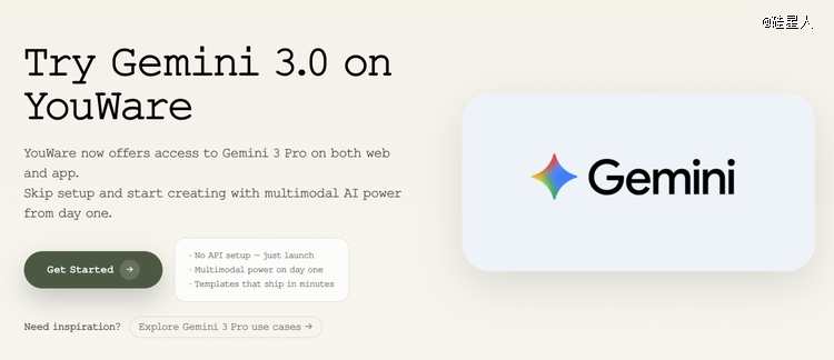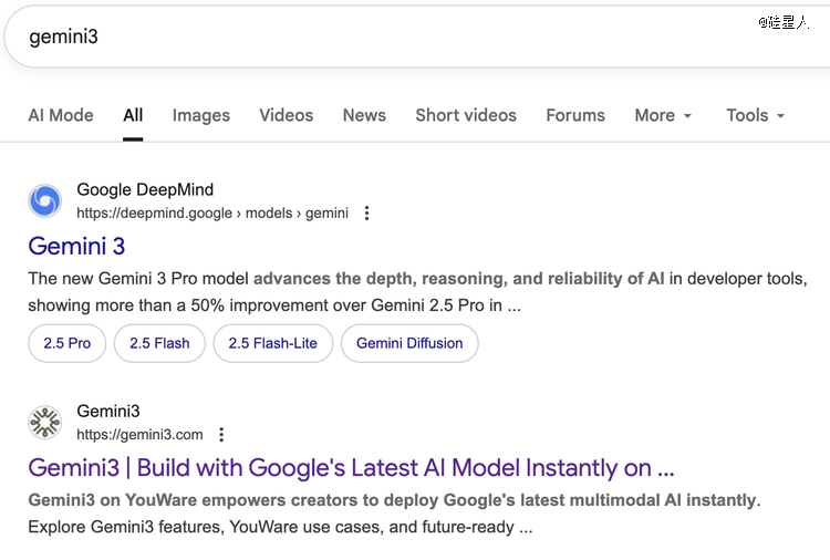 还有人在域名上做文章。gemini3.com这个域名被一个AI编程平台YouWare提前注册,页面做成了免费试用Gemini 3 Pro的样子。当Google正式发布Gemini 3时,这个域名直接挤进了搜索结果前列,为这个平台带来了一波开发者注册。