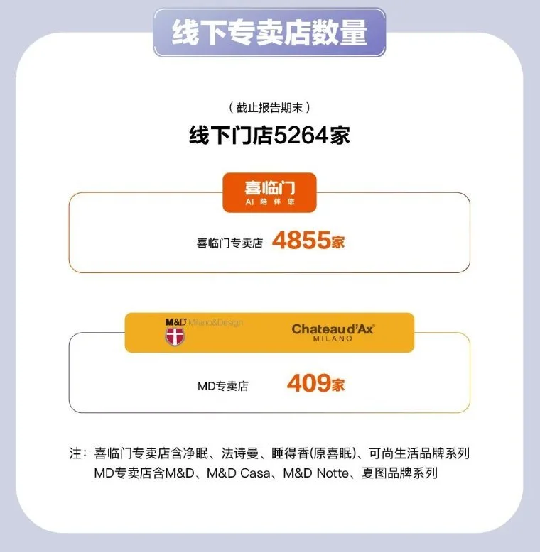 截至报告期末,喜临门旗下门店总数达到5264家,其中喜临门专卖店4855家,MD专卖店409家,形成了广泛的市场覆盖网络。
