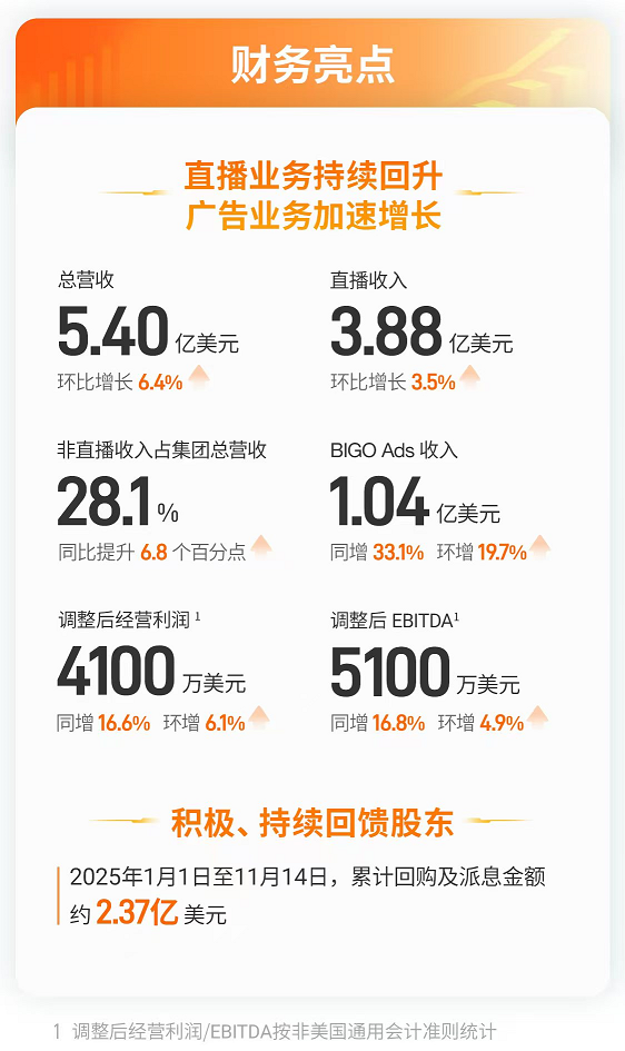 北京时间2025年11月20日,欢聚集团(NASDAQ:JOYY,简称“欢聚”/“集团”)发布2025年第三季度财报。本季度直播主业环比持续稳健增长,广告技术平台BIGO Ads同比、环比均加速高增长,管理层在业绩发布会上表达了对集团2026年成长确定性的强大信心和组织动力,并表示将积极加速回购,股东可期待更多回报。