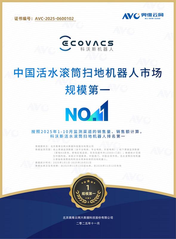 此次奥维云网的权威认证,不仅再次确认了科沃斯在滚筒赛道的领 先地位,也进一步强化了“滚筒洗地机器人=科沃斯”的行业共识。2025年被业内视为扫地机的“滚筒年”,科沃斯将在连续十年中国市场规模第 一的基础上,以此次认证为新的起点,坚持以技术创新为核心驱动力,以引领者之姿推动行业持续跃升,带动智能清洁行业迈向更高质量发展,为用户提供更高效、更可靠的清洁体验。