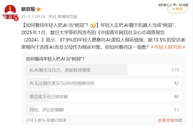 复旦大学等机构也在今年发布《中国青年网民社会心态调查报告(2024)》,当中显示37.9%的年轻人愿意向AI虚拟人倾诉烦恼,超13.5%的受访者更倾向于选择AI而非父母作为倾诉对象。