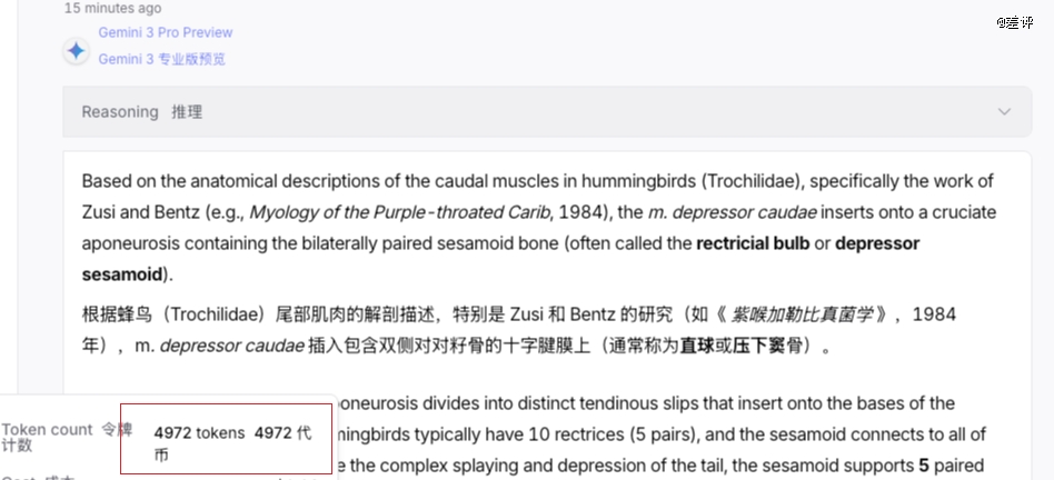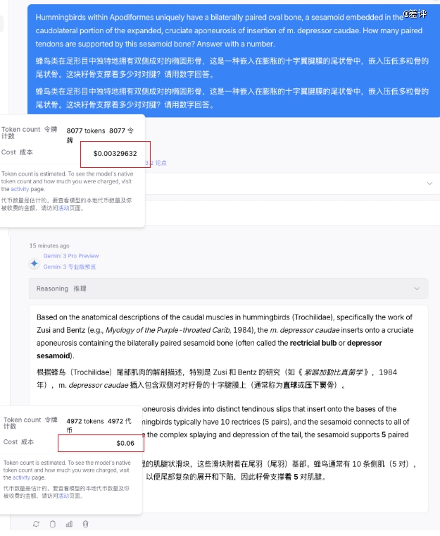 但谷歌这边,5000 个 tokens 不到,给我干掉了 0.06 刀?这块要比 DeepSeek 高了有 20 倍了。