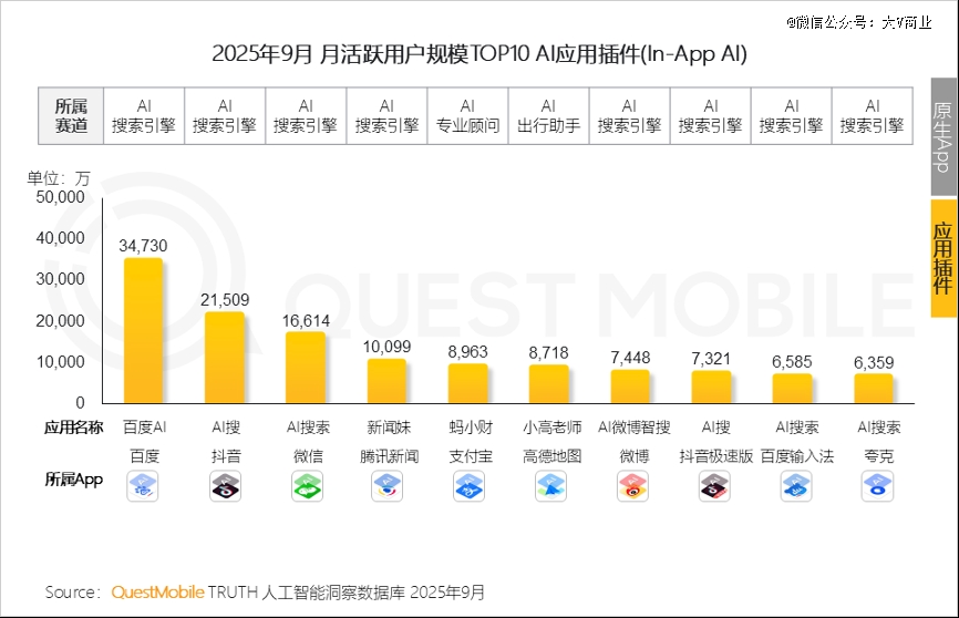 QuestMobile数据显示,今年9月中国月活跃用户排名前三的AI应用中,豆包、DeepSeek、腾讯元宝分列前三,MAU分别为1.72亿、1.45亿、3286万。通义排在第十,月活跃用户仅有为306万。
