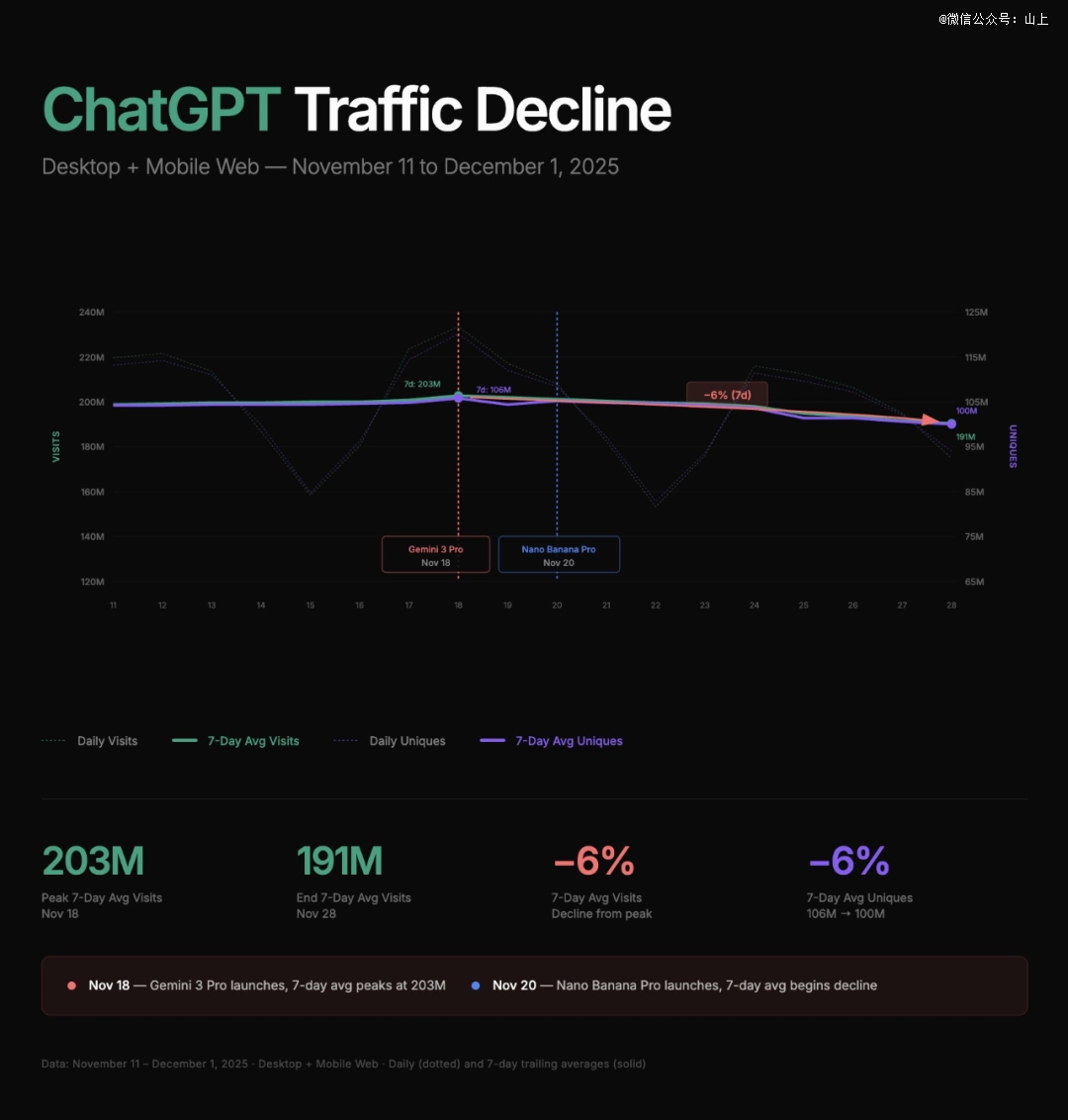 硅谷投资机构 Menlo Ventures 合伙人 Deedy Das 援引 Similarweb 数据称,自 Gemini 3 上线两周来,ChatGPT 的每日独立活跃用户(7 天平均值)下降了 6%。而同一时间内,Gemini 的使用量出现明显增长,占 ChatGPT 流量比例从 22% 增长至 31%。