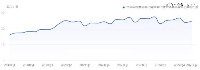 据“中经数据”,自2021年以来,实物商品网上零售额占社会消费品零售总额的比重长期稳定在24%-27%的区间,线上渗透率增长见顶。2025年前三季度,在补贴政策推动下,实物商品网上零售额整体增长6.5%,高于社会消费品零售总额增速。然而,增量主要集中在国家补贴发放的第 一季度。从趋势看,二、三季度同比增速均出现不同程度下滑,其中三季度下滑幅度达2.5%。