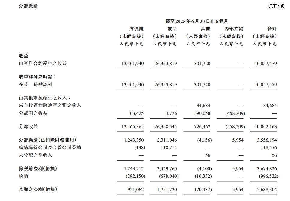 从财报数据来看,2025年上半年统一总营收约170.87 亿元,同比增长10.6%,净利润为12.87亿元,同比上升33.2%。其中饮品业务录得107.88亿元的收益,占总营收的63.1%,同比增长7.6%,是拉动集团增长的首要引擎。