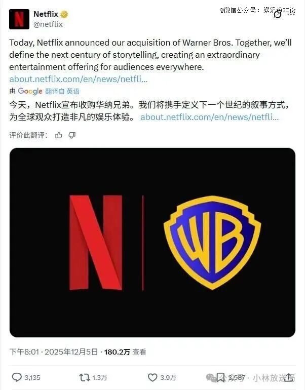北京时间12月5日20时许,跨国流媒体巨头Netflix(非官方译作“网飞”)宣布,以827 亿美元(股权价值为 720 亿美元)收购华纳兄弟探索(WBD)的一半资产。