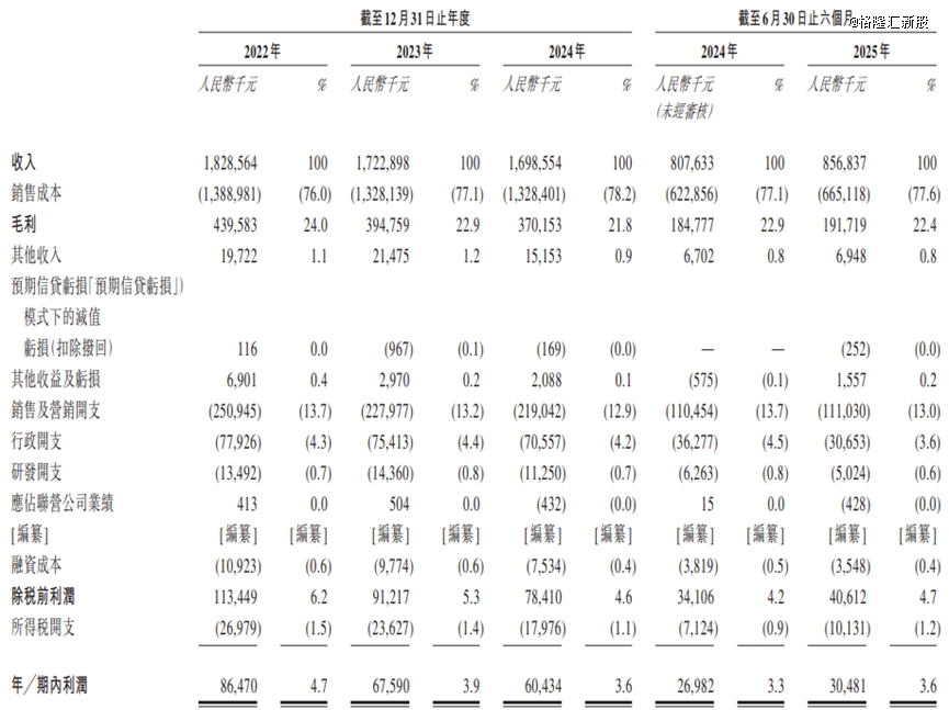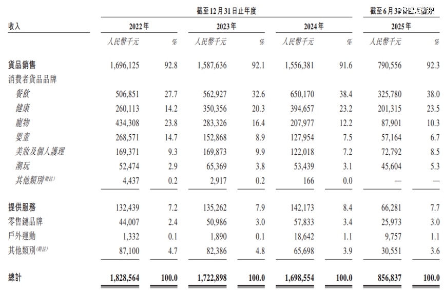 按货品及服务类型划分,2022年至2025年上半年(简称“报告期”),公司超过90%的收入来自货品销售业务,提供服务的收入占比较低。