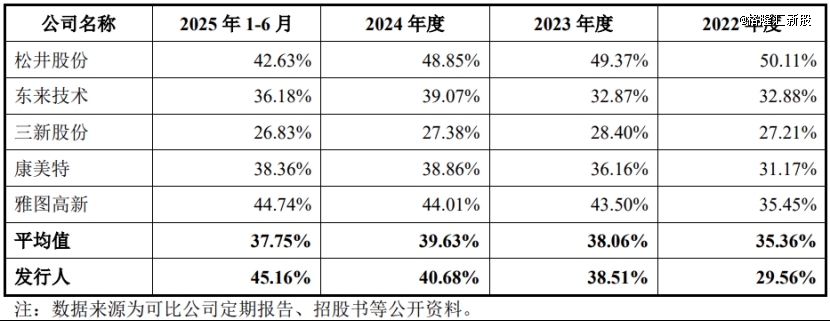 最近三年,慧谷新材的综合毛利率分别为29.56%、38.51%和40.68%,处于同行业可比公司毛利率区间范围内。2025年1-6月,受益于产品结构优化和化工原材料市场价格下行,慧谷新材的毛利率继续提升,同行业松井股份、东来技术、康美特由于客户和产品结构变动等因素,毛利率有所下降。