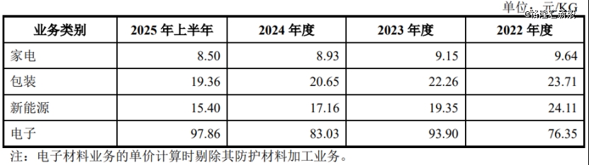 家电材料、包装材料、新能源材料、电子材料业务平均单价,图片来源于招股书