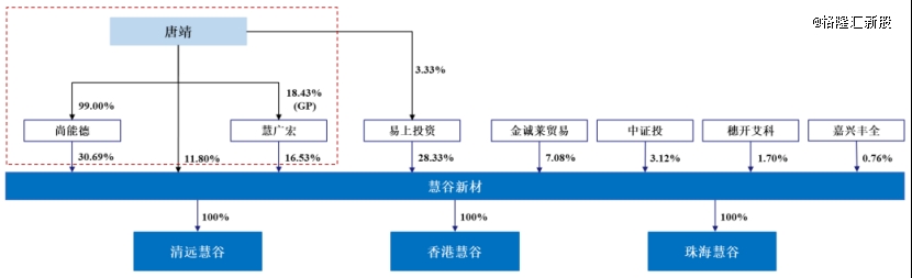 本次发行前,唐靖直接持有慧谷新材11.8%的股份,通过尚能德、慧广宏分别控制30.69%、16.53%表决权,唐靖合计控制59.02%的表决权,为公司实际控制人。此外,金诚莱贸易、中证投、穗开艾科均为公司股东。