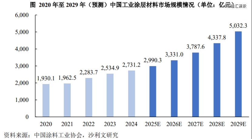 市场规模方面,据沙利文研究数据,2024年中国工业涂料市场规模超过2700亿元。近年来,国家大力推动涂层材料产业下游应用场景的深化和拓展,预计在2024年至2029年,工业涂层材料的年复合增长率将达到13%。