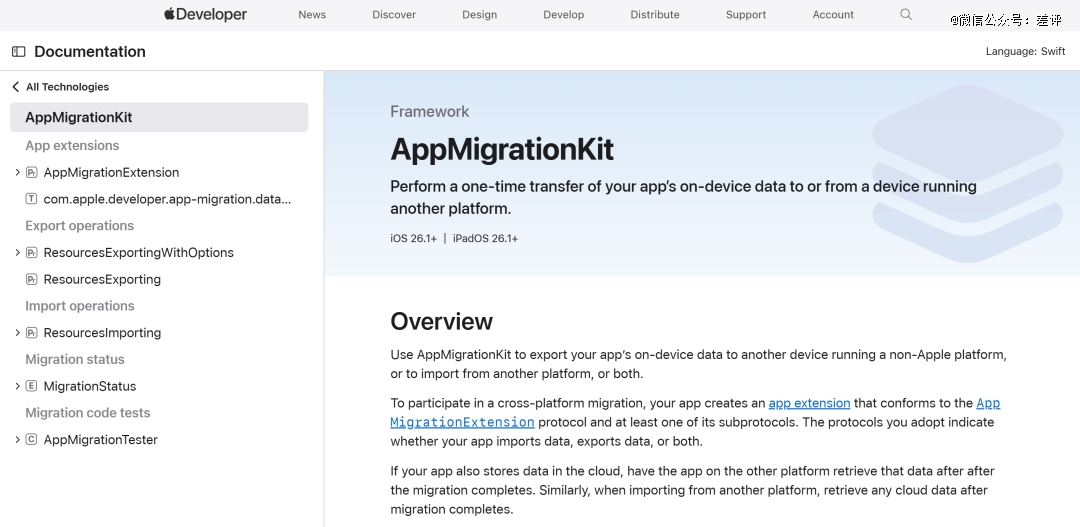 但今年 10 月份,苹果在自家开发者页面上悄悄整了个名叫 “ AppMigrationKit ( 应用迁移套件 )” 的新框架文档,也许就是冲着解决换机这件事去的。
