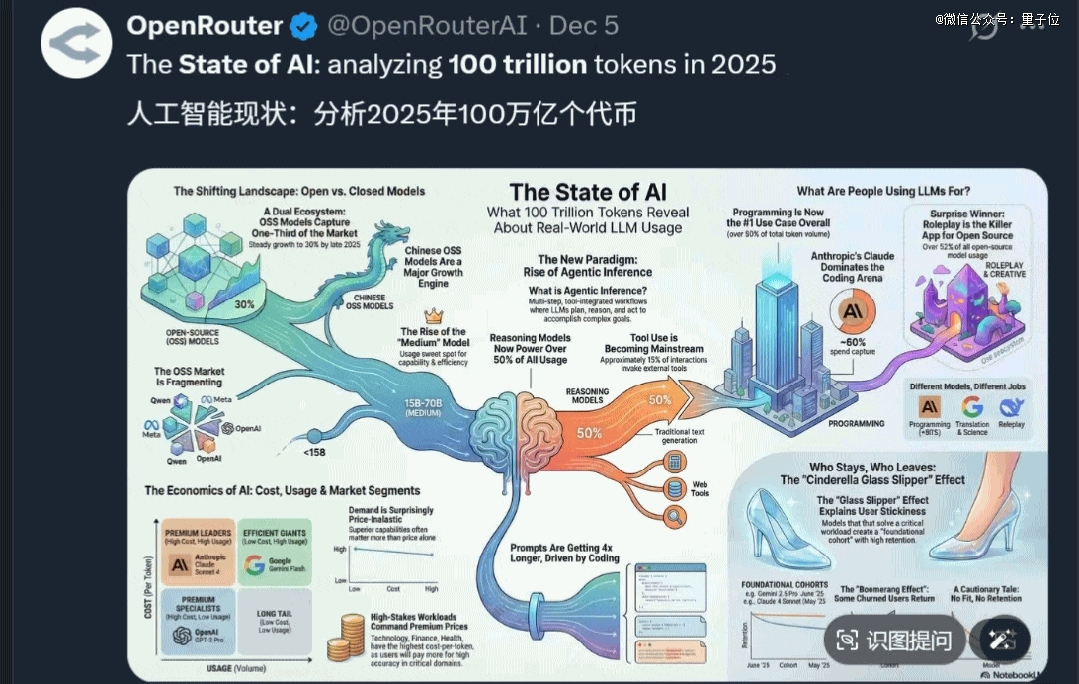 里面分析了自2024年11月至2025年11月,OpenRouter平台上300+模型的使用情况,涵盖GPT系列、Claude、Gemini、DeepSeek、Qwen、Kimi等国内外主流开源与闭源模型。