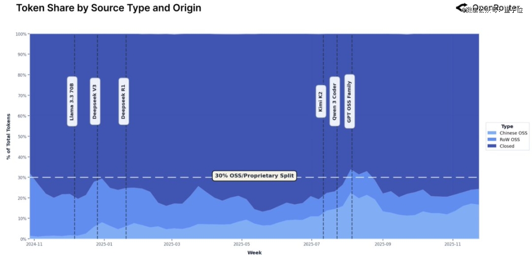 开源力量中,中国模型尤为受到青睐,流量份额从1.2%激增至30%;