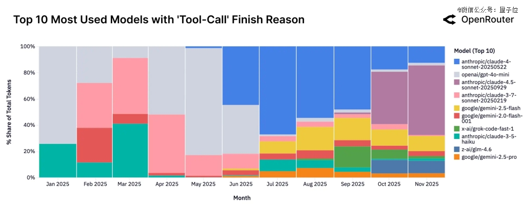 同时,模型调用工具的占比也在上升。