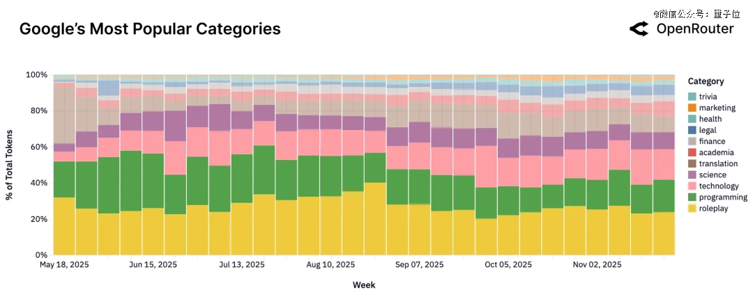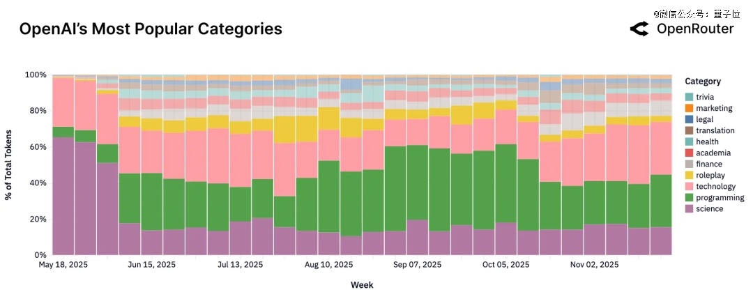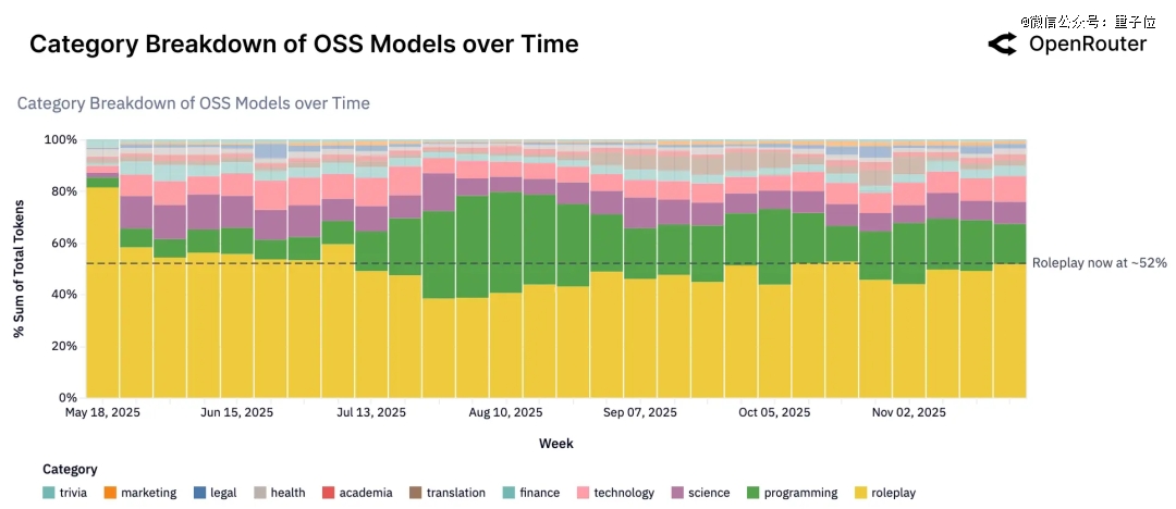此外,角色扮演也几乎与编程持平。在开源模型中(一般限制会更小一点),它甚至占到52%的使用量。