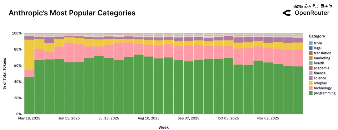 Anthropic显然是当之无愧的程序员,其80%以上流量均用于编程和技术任务。