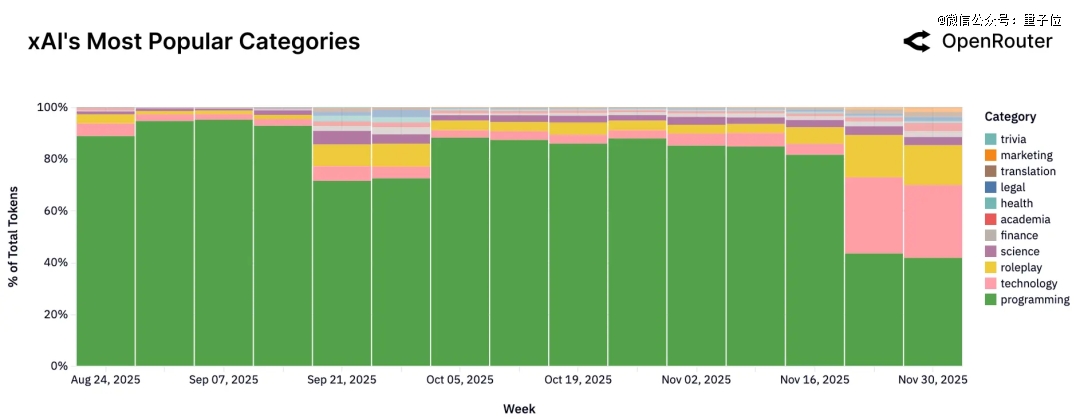 马斯克旗下的xAI也在死磕编程,其技术应用、角色扮演及学术用途在十一月下旬显著增长。
