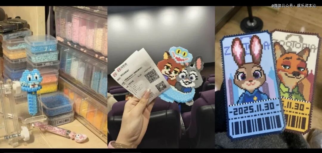 社交平台上,IP爱好者们争相将兔朱迪与狐尼克制作成像素风格的拼豆作品;线下手作店里,年轻人们则用一两个小时,专注地将对狐兔CP的喜爱倾注进一粒粒豆子中,制成专属摆件、创意票根。