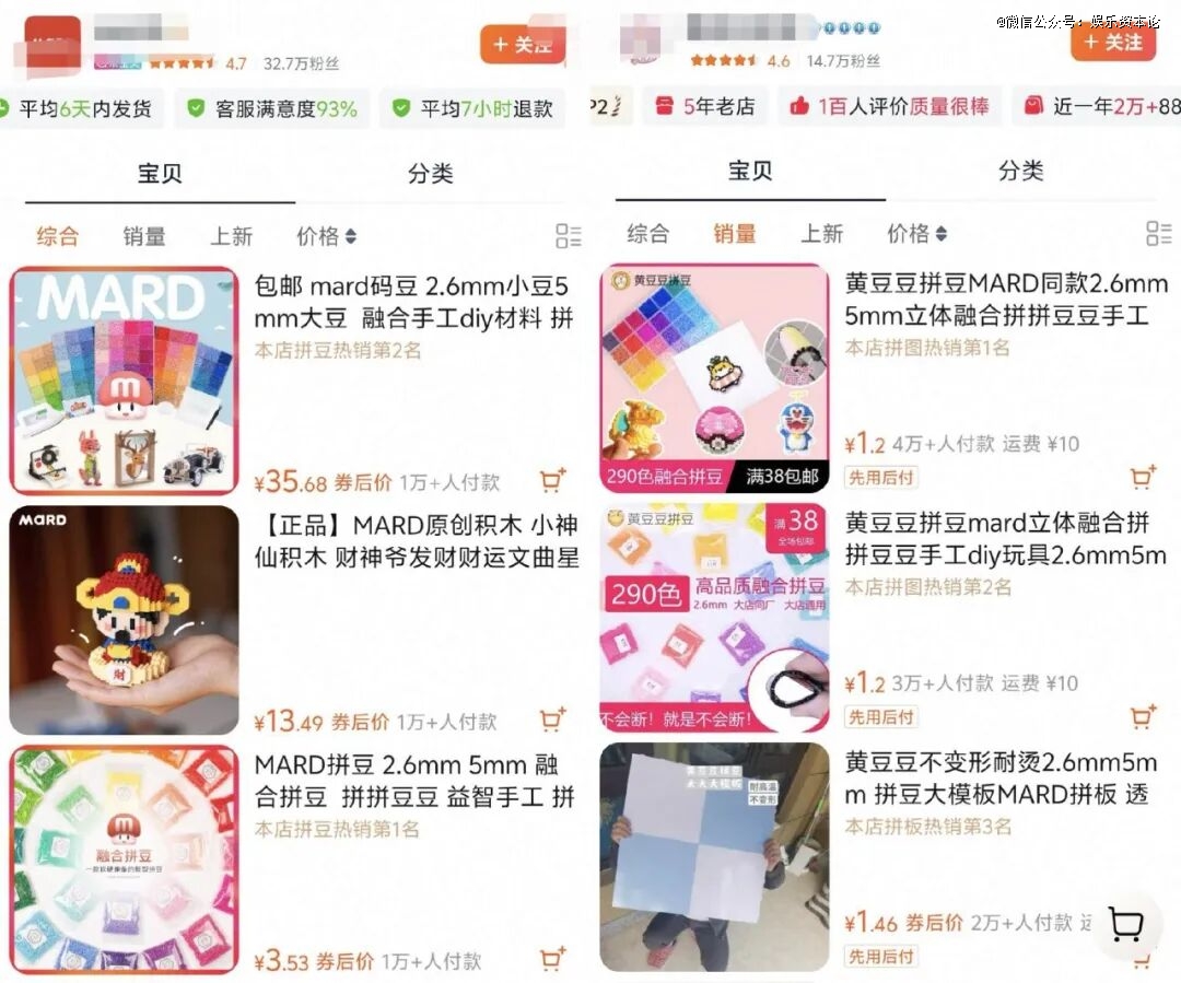 除了教程分享和作品展示,拼豆的交易环节在电商与社交平台之间可以做到无缝衔接。淘宝、拼多多上售卖拼豆材料包、专用工具及成品的热门店铺众多,拼豆材料复购率强,大多数爱好者会为了补齐颜色或尝试新图不断回购,因此各家店铺都不乏销量数万件的爆款。