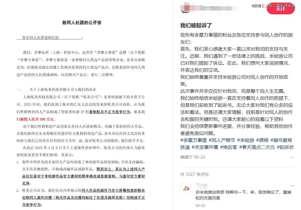 米哈游曾起诉全国连锁的谷子店“多摩万事屋”,因其销售未经授权的《原神》同人产品,最终明确划定了“个人小规模创作可容忍,规模化商业经营必追究”的法律红线。