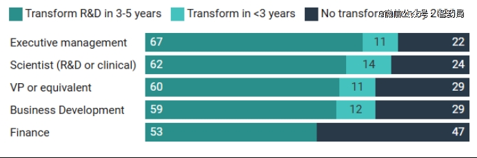 制药业的高管和科学家对人工智能的前景最为看好,超过78%的受访者认为AI将在3-5年内变革药物研发。