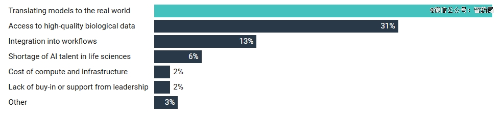 工作流程集成排到第三(13%),紧接着才是缺少AI+生命科学人才(6%)、缺少领导层的支持(2%)和计算成本(2%)。
