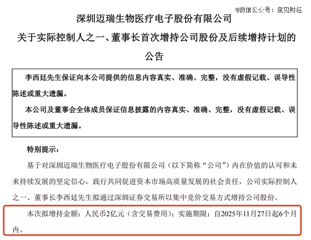 增持公告中迈瑞医疗还表示,在未来的6个月内,公司董事长李西廷将继续增持公司股份,增持金额2亿元(含本次增持金额)。