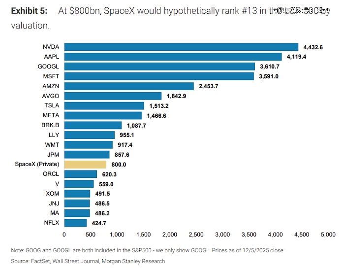 大摩称,如果将SpaceX置于标普500指数中,8000亿美元的市值将使其排在第13位,介于摩根大通和甲骨文之间。