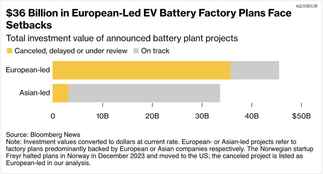 按照彭博社去年统计,计划在欧洲建设的16家工厂,已经有11家推迟或取消。其中奔驰合资电池公司ACC已经放弃新建工厂,大众PowerCo也收缩了全球扩张的计划。