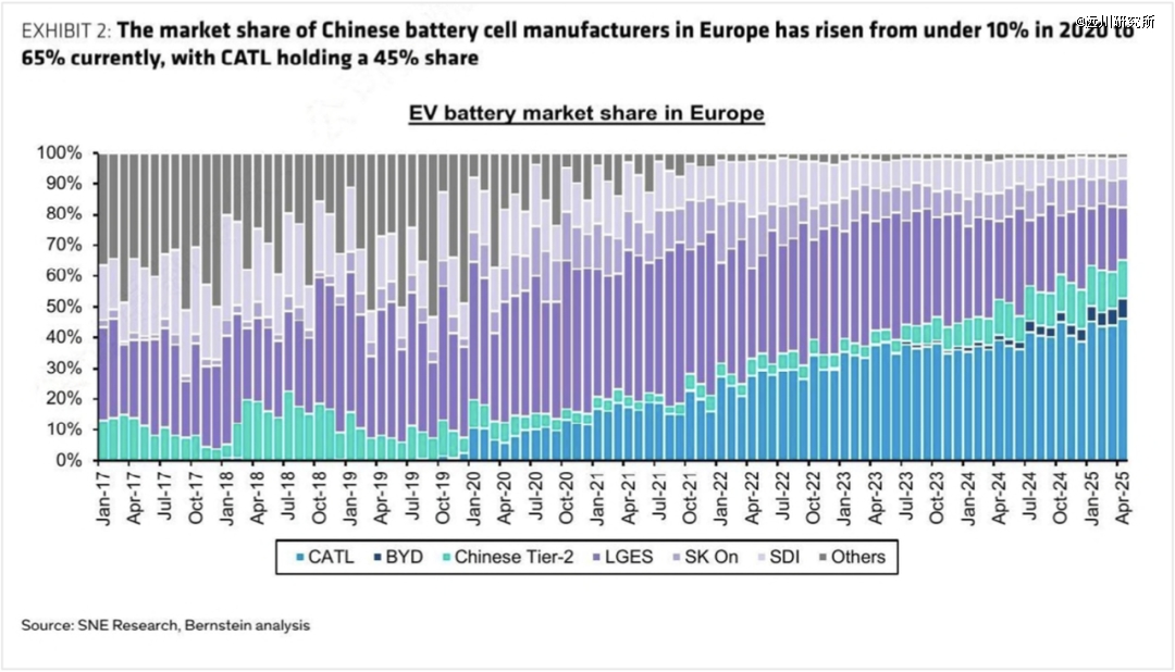 中国电池企业在欧洲份额从2020年<10%升至当前65%,宁德时代占45%
