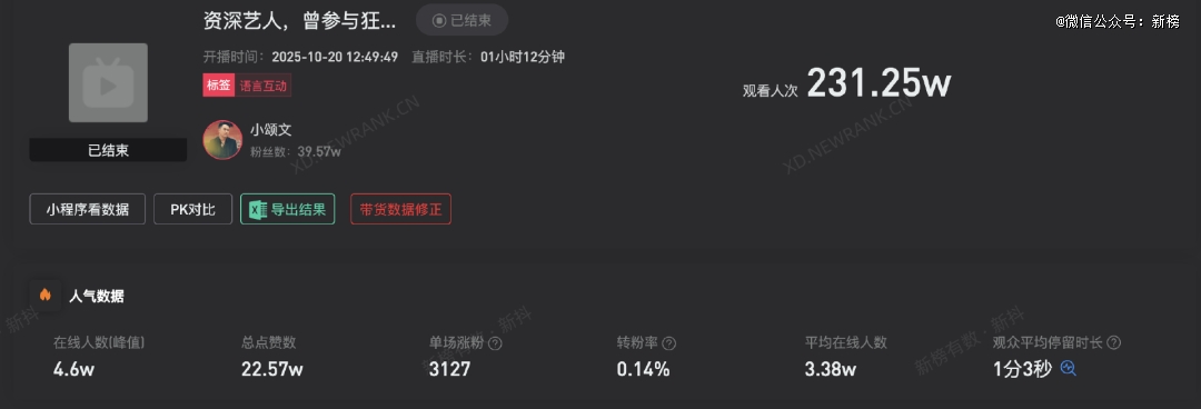新抖数据显示,10月20日开始,“小颂文”在抖音账号开始团播,截至目前,他一共进行了18场直播,累计观看人次为1512.03万,其10月20日的一场直播热度最高,单场直播累计观看人次达231.25万,在线人数峰值为4.6万。