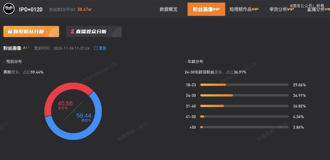 从新抖数据显示的粉丝画像来看,“IPO·0120”抖音账号的粉丝中,24-30岁年龄段粉丝居多,占比36.91%。
