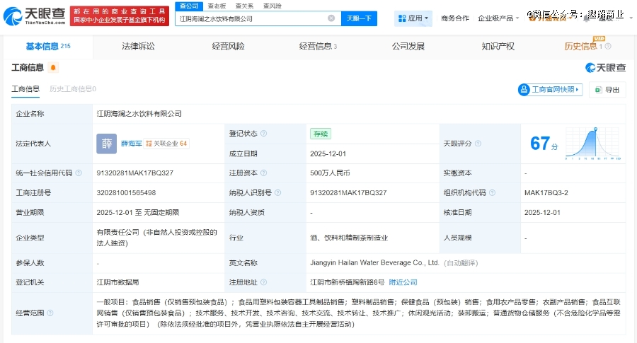 有意思的是,天眼查数据显示,12月1日,在海澜集团成立37周年当天,成立了一家名为“江阴海澜之水饮料有限公司”的孙公司,经营范围包括食品销售、保健食品销售等;让人不仅疑问,海澜之家是要跨界卖水饮吗?
