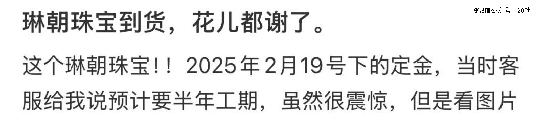 付了定金后,就是漫长的等待。10克左右的小吊坠,工期也是半年起。有人在等待半年后,卑微寻问客服,“什么时候可以付尾款”,才发现工期延长了。