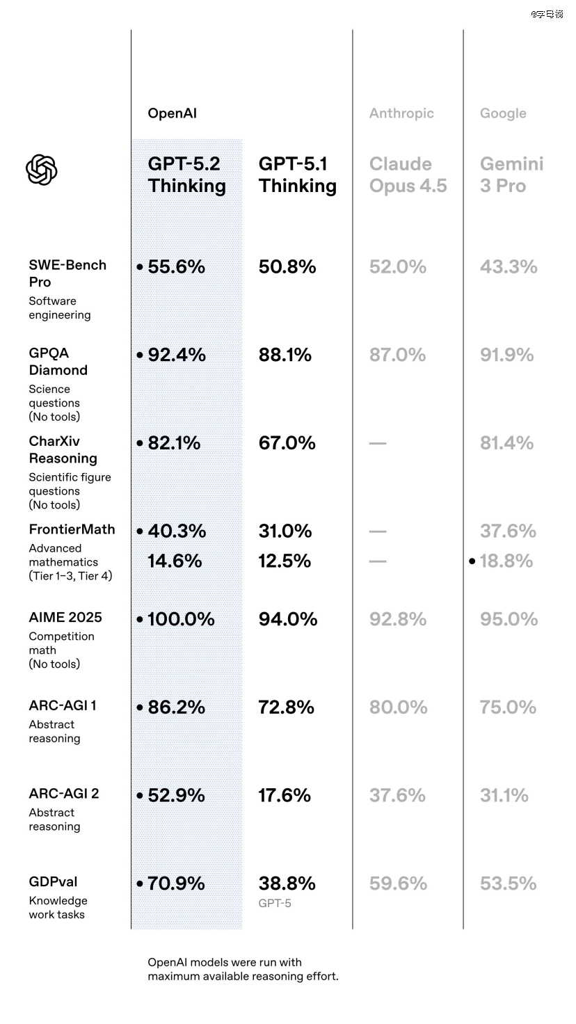 虽然在时间上,GPT-5.2只跟5.1相隔了一个月。但是从公布的性能数据来看,GPT-5.2较上一代提升巨大,而且远超谷歌和Anthropic的同期产品。