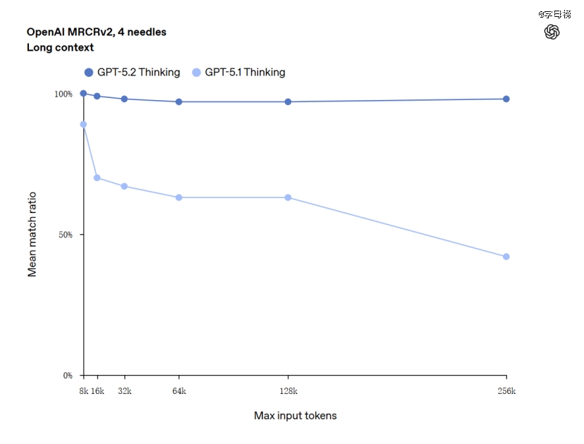GPT-5.2在长文档理解上也有明显进步。在OpenAI的MRCRv2测试中,它成为首 个在256k token长度下,针对4-needle变体任务达到近乎100%准确率的模型。