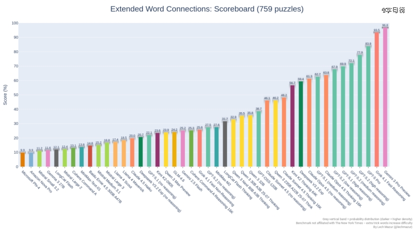 这个结果多少有些出人意料。GPT-5.2在数学竞赛中能拿满分,在专业工作任务中能超越人类专家,但在这个看似简单的文字游戏上,却落后于竞争对手近20个百分点。