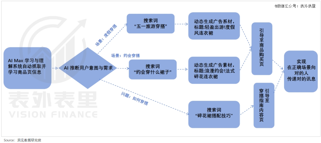 当用户搜索“五一旅游穿搭”或“约会穿什么裙子”时,AI也会推断出用户意图,自行拟定标题、生成描述、选择落地页,把商品融入搜索结果中。