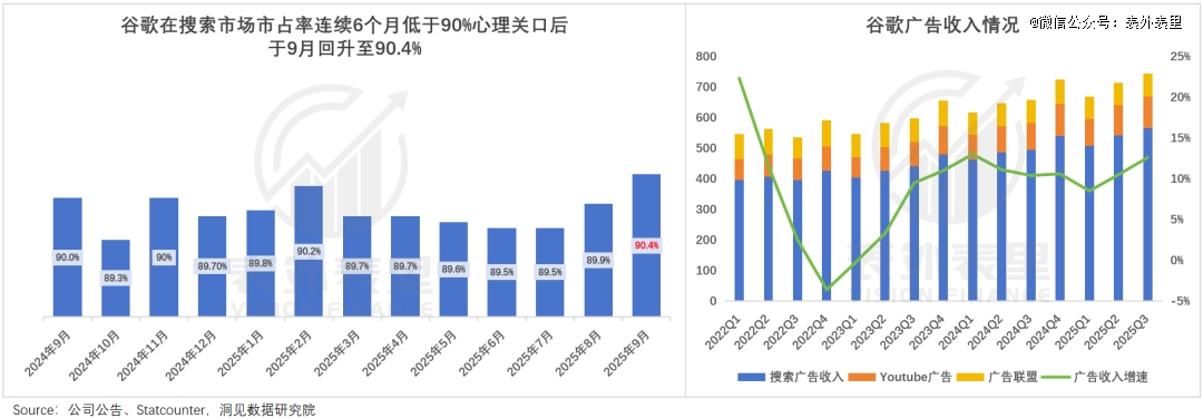 但冲击在这个夏天戛然而止。三季度,谷歌浏览器在搜索市场份额回升至90%,广告业务增速也止住了放缓趋势,连续两个季度加速增长。