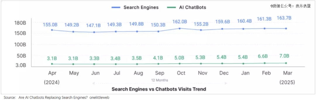 二者不是“你死我活”,而是互为补充,共同推高搜索体验的天花板。一份研究就显示,AI聊天助手流量爆发的时候,搜索引擎的体量并没有大受冲击。
