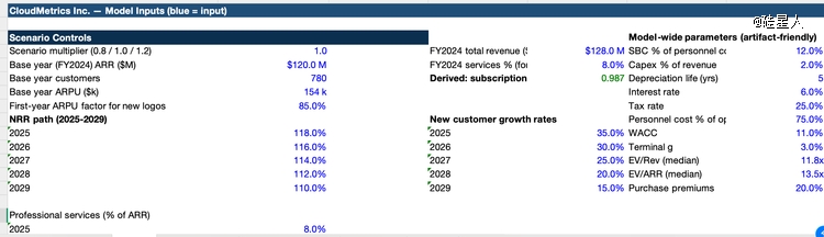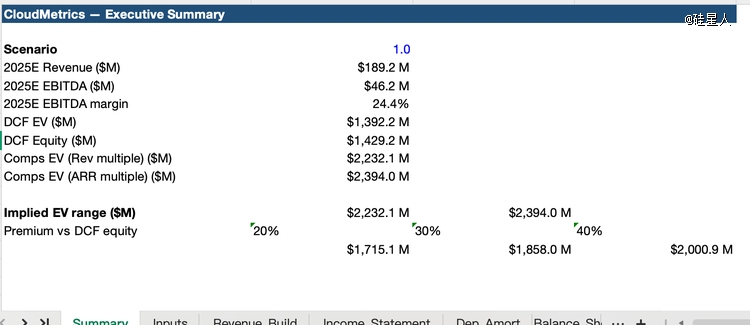 投行三表 + 估值:不是让它算个增长率,而是让它按投行标准搭完整三表联动、做 2025–2029 收入拆分、三场景、DCF、可比公司倍数,连“蓝色输入、黑色公式、绿色外链”这种洁癖都写进要求里。