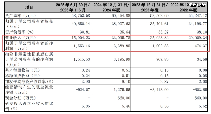 2022年、2023年、2024年及2025年1-6月(报告期),公司营业收入分别为2亿元、2.5亿元、3.31亿元、1.59亿元,公司净利润分别为474.37万元、1002.83 万元、3389.85万元、1553.16万元。