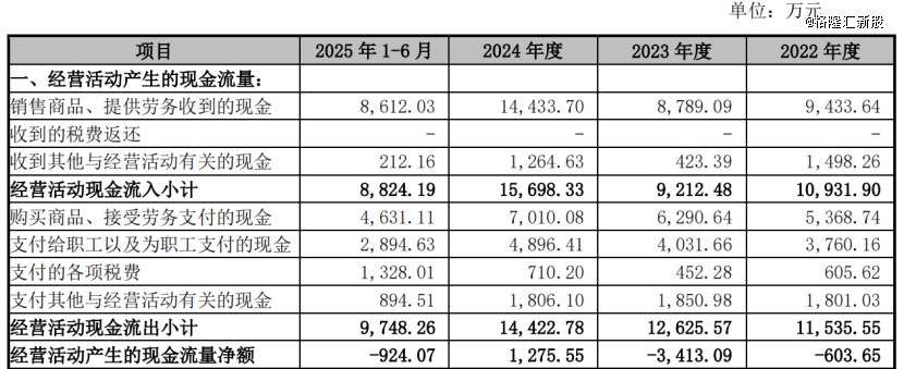 此外,公司的经营性现金流并不乐观,2022年、2023年及2025年1-6 月录得负值,主要系公司销售环节票据结算比例较高,且收现规模低于付现规模所致。