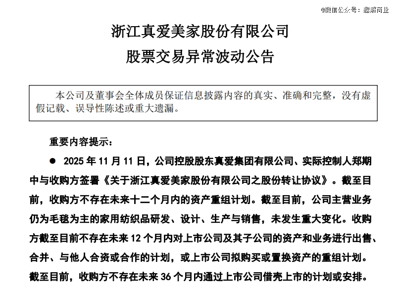 面对股价异动,真爱美家很快发布公告称,目前经营一切正常。“截至目前,公司主营业务未发生重大变化,收购方不存在未来36个月内通过上市公司借壳上市的计划或安排。”
