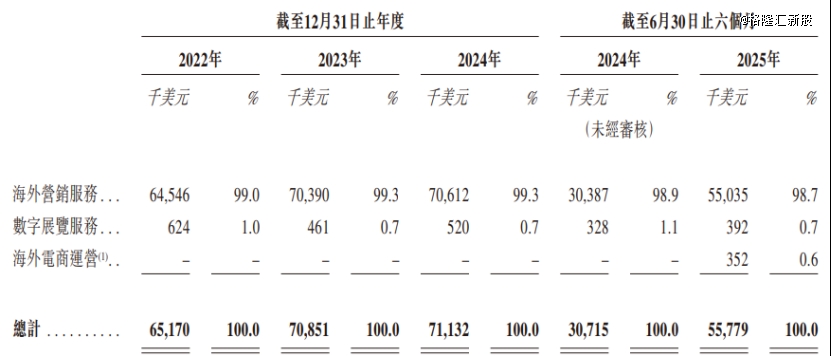 具体来看,2022年至2025年上半年(简称“报告期”),海外营销服务为米多多贡献了98%以上的收入,为重要收入来源。