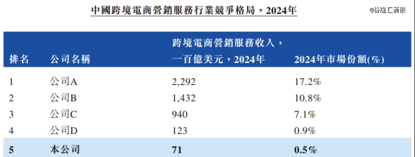 据灼识咨询的资料,2024年五大市场参与者占市场总份额约36.5%。其中,按2024年跨境电商营销服务收入计,米多多为中国第五大跨境电商营销服务提供商,市场份额仅为0.5%。